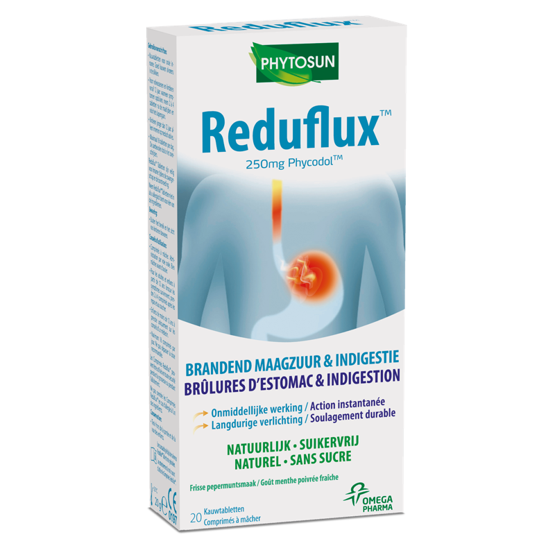 Reduflux™ proporciona un alivio rápido y duradero de la acidez y la indigestión. Gracias a su componente Phycodol™, permite una acción inmediata y una protección duradera de hasta 4 horas. Reduflux™ contiene Phycodol™, un alginato formulado con extractos de algas pardas de alta calidad. Este alginato de alta calidad permite la formación de una barrera protectora en la parte superior del estómago que elimina de forma inmediata el reflujo ácido, al tiempo que protege contra el dolor y el malestar.
