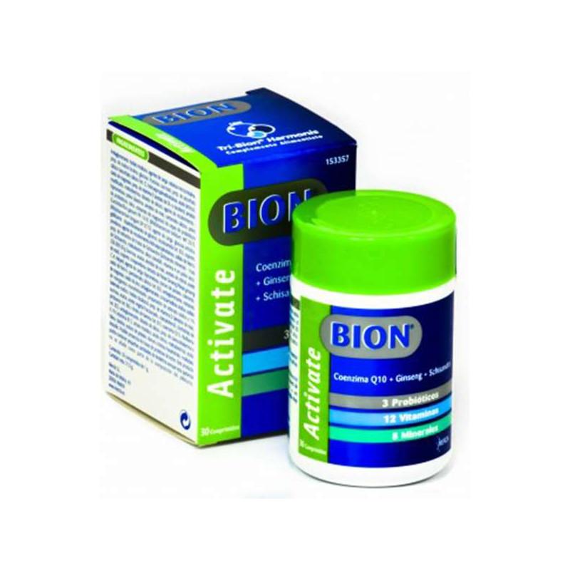 Bion Activate es un complemento alimenticio de nueva generación que asocia 12 vitaminas, 8 minerales, 3 cepas de probióticos, coenzima Q10 y 2 extractos vegetales: ginseng y schisandra. Bion Activate ha sido desarrollado para hacer frente a ritmos de vida muy activos y en períodos de sobreesfuerzo y desgaste. Bion Activate contribuye a recuperar el tono vital gracias a la coenzima Q10 y a los extractos vegetales de ginseng y schisandra. Bion Activate aporta, además, probióticos, microorganismos beneficiosos que mantienen la flora intestinal equilibrada y refuerzan las defensas.