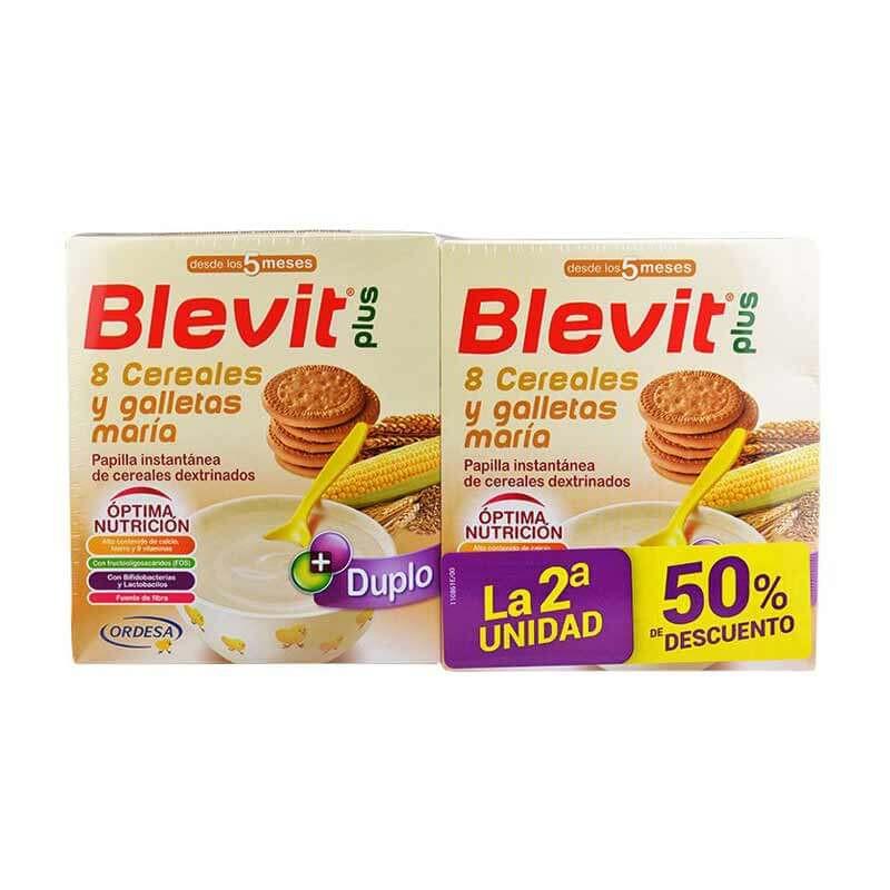 Blevit Plus Duplo 8 Cereales y Galletas María es una papilla elaborada a partir de una equilibrada mezcla de 8 cereales (trigo, arroz, avena, cebada, centeno, maíz, mijo y sorgo), galletas María, así como probióticos y prebióticos. Las galletas María proporcionan a la papilla un elevado valor nutricional y la convierten en una excelente fuente de energía con un delicioso sabor y textura. Además, mejoran su aceptación por parte del bebé, ya que son uno de sus alimentos preferidos. Los prebióticos y los probióticos se complementan para favorecer el crecimiento de la flora intestinal saludable y un perfecto funcionamiento del sistema digestivo del bebé.