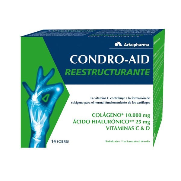Condro Aid Reestructurante es un complemento alimenticio a base de colágeno, ácido hialurónico y vitaminas C y D. La formación adecuada de colágeno es necesaria para que la estructura de diversos tejidos (huesos, cartílagos, tendones) en el organismo sea normal, ya que el colágeno es un componente estructural de estos tejidos. Condro Aid Reestructurante contiene vitamina C, que participa en la síntesis de colágeno, contribuyendo al normal funcionamiento del sistema articular.