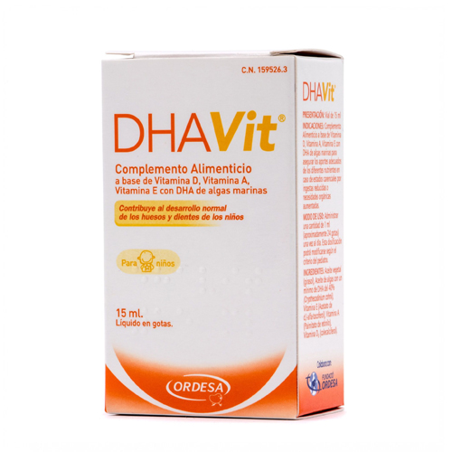 DHAVit es un complemento alimenticio a base de Vitamina D, Vitamina A, Vitamina E y DHA de algas marinas. ¿Qué es el DHA (ácido docosahexaenoico)? El DHA es un ácido graso poliinsaturado de la serie omega-3, constituyente fundamental de las células del Sistema Nervioso Central, indispensable durante el desarrollo y el crecimiento. El cerebro humano presenta un elevado contenido de ácidos grasos, de los cuales el DHA es el principal componente. Por tanto, un adecuado aporte de DHA permite un óptimo desarrollo neuronal del bebé, influenciando positivamente en las funciones cognitivas, la agudeza visual y el correcto crecimiento. Diversos estudios han demostrado que los efectos positivos de la suplementación dietética con DHA durante los 2 primeros años de vida proporcionan beneficios a corto y largo plazo. ¿Por qué DHA de alga? En DHAVit, la fuente de DHA son las algas marinas contenidas en el plancton del que los peces se nutren. El aceite de algas es de una pureza y concentración de DHA superior al del aceite de pescado y es mucho mejor tolerado por ser insípido e inodoro.