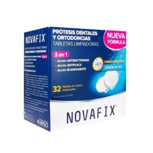 Las tabletas NOVAFIX están destinadas a la limpieza de prótesis dentales. Las tabletas limpiadoras antibacterianas, con su fórmula 3 en 1, liberan oxígeno activo que previene la formación de sarro, elimina las manchas y la placa dental, y proporciona una agradable sensación refrescante en la boca. Su uso diario permite conservar la dentadura con todo su brillo y color natural. Son ideales para una rápida limpieza de las prótesis dentales y aparatos de ortodoncia. Marcado CE. ON: 0499. Clase IIb, no estéril.