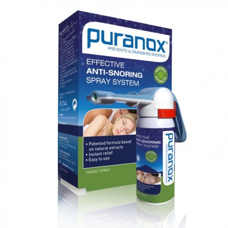 Puranox Spray 45 ml. Es un spray formulado a base de extractos naturales que previene y reduce los ronquidos. Alivia al instante y es fácil de usar. Reduce las vibraciones del tejido blando de la parte posterior de la garganta mediante la tensión y lubricación activas de los tejidos durante la noche.