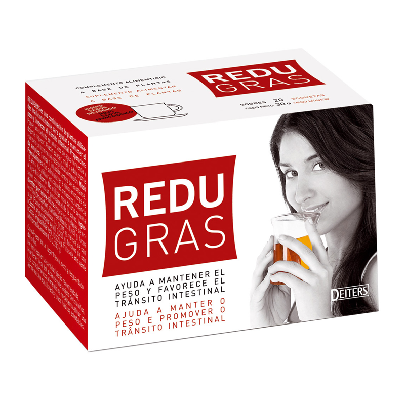 DESCRIPCIÓN: Redugras es un complemento alimenticio en forma de sobres-filtro para infusión, con una cuidada mezcla de plantas que ayudan en el mantenimiento del peso y favorecen el tránsito intestinal.