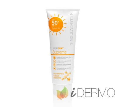 La emulsión fluida ultraligera SINGULADERM XPERTSUN SUPREME transforma las propiedades naturales de la piel en un verdadero escudo fotoprotector de amplio espectro (UVA/UVB/IR). Su exclusiva combinación de filtros fotodérmicos y convencionales proporciona a la piel la máxima cobertura en protección solar: SPF 50+, UVA (PA++++) e IR. Protege la piel de los dañinos rayos solares, ayuda a reparar las fotolesiones ya existentes y preserva la integridad de las células durante la exposición solar. Potenciada con una exclusiva combinación de filtros fotodérmicos, esta fórmula ofrece un aspecto más firme y terso a la piel. Resistente al agua (40 minutos) y al sudor. No pica en los ojos.