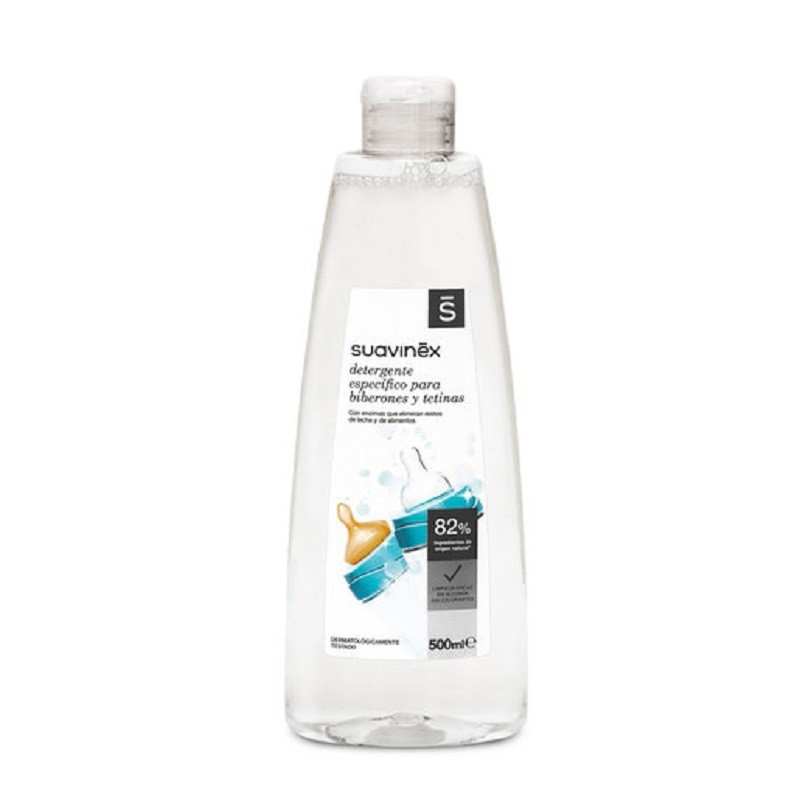 El detergente para biberones y tetinas de Suavinex limpia en profundidad los restos de leche, papilla y zumo, así como los restos de comida de la vajilla infantil (platos, tazas, cubiertos). Además, resulta muy eficaz tanto en el lavado de extractores de leche como de otros accesorios que el bebé se lleva a la boca (chupetes, mordedores, sonajeros). Formulado con ingredientes naturales y enzimas que eliminan con facilidad las proteínas de la leche y otros restos de alimentos de forma segura para tu bebé.